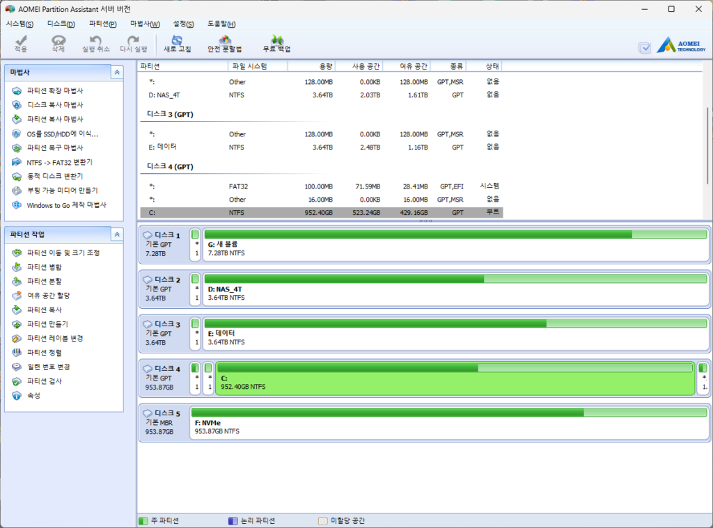 파티션 줄이기 늘이기 이동 통합관리 관리자 AOMEI Partition Assistant 이용해 간단하게 조치하는데요. 윈도우, 맥, linux 등 모든 운영체제의 파티션을 조절할 수 있습니다.